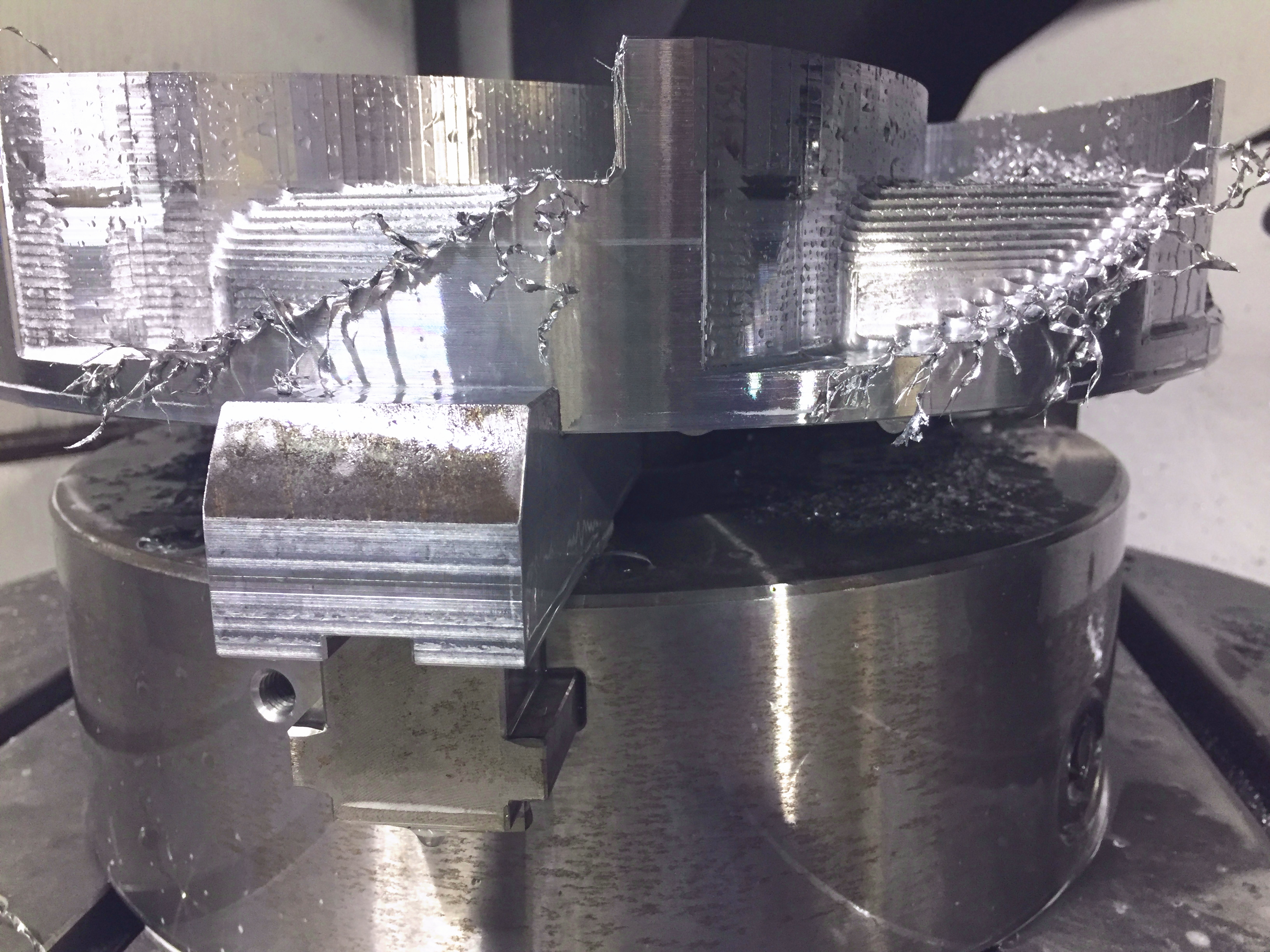 5軸制御のマシニングセンタでエンドミルを使って等高線荒加工
