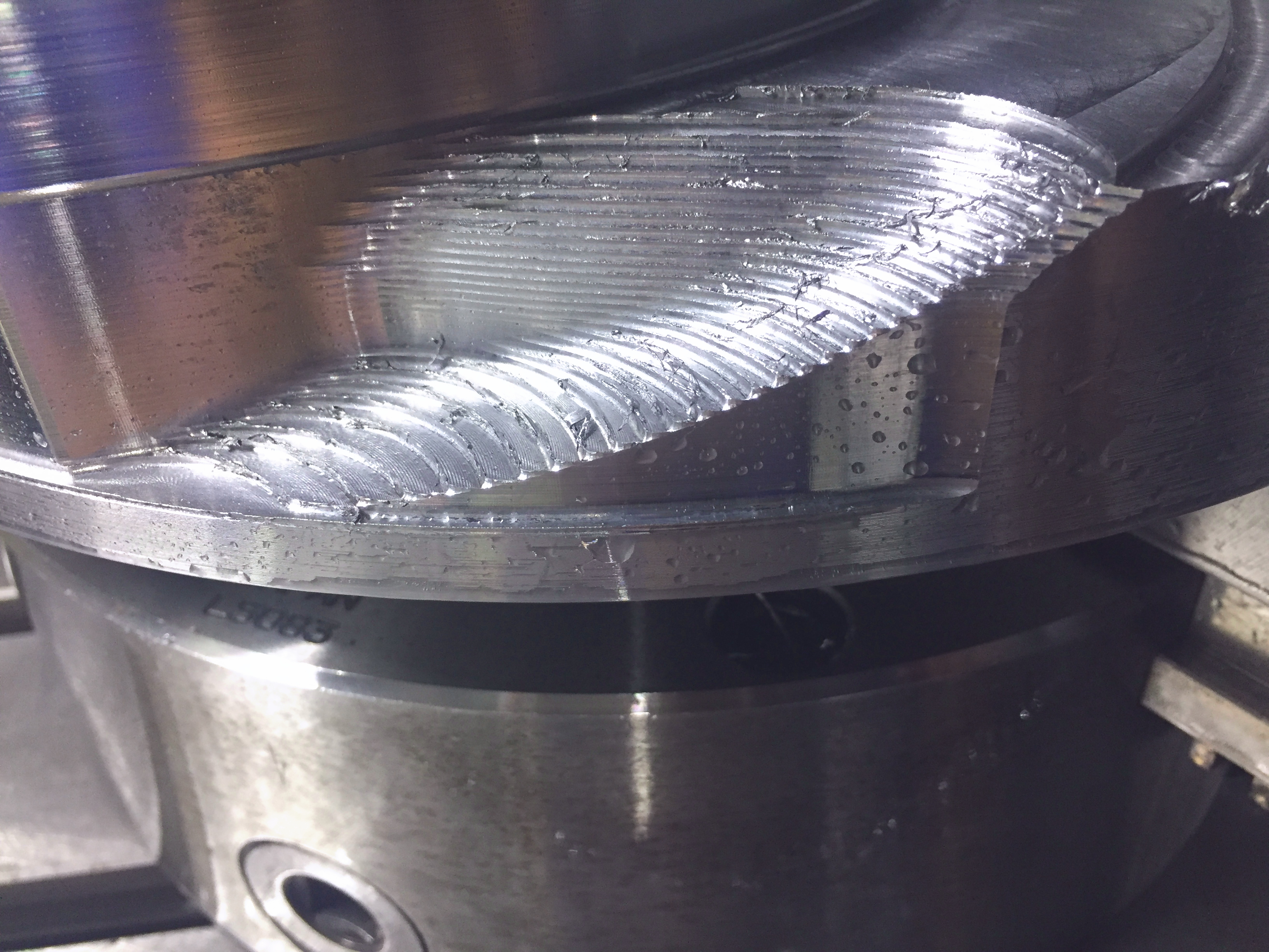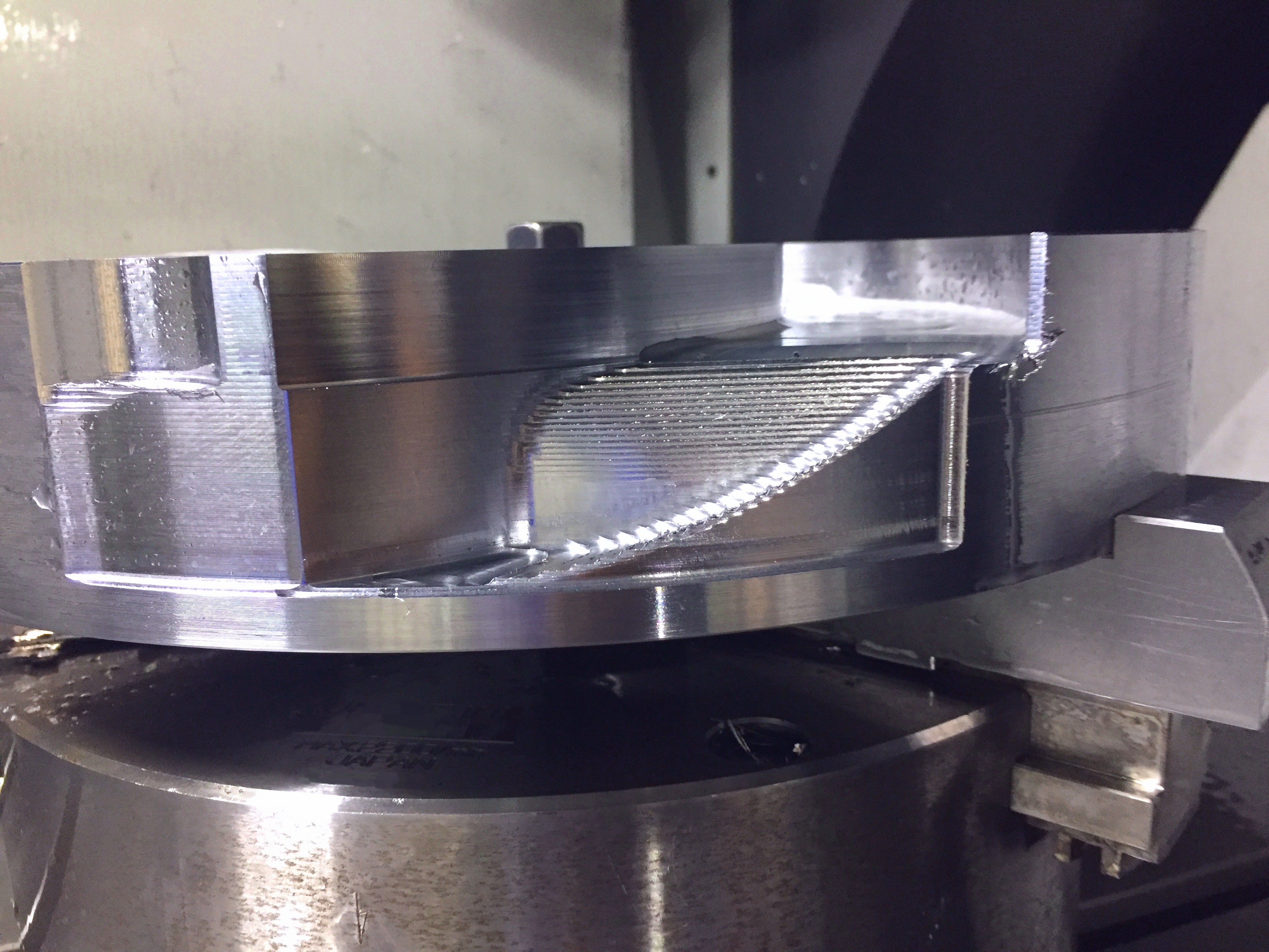 5軸制御のマシニングセンタでラジアスエンドミルを使って曲面形状部の等高線荒加工をしたときのフリー画像です。