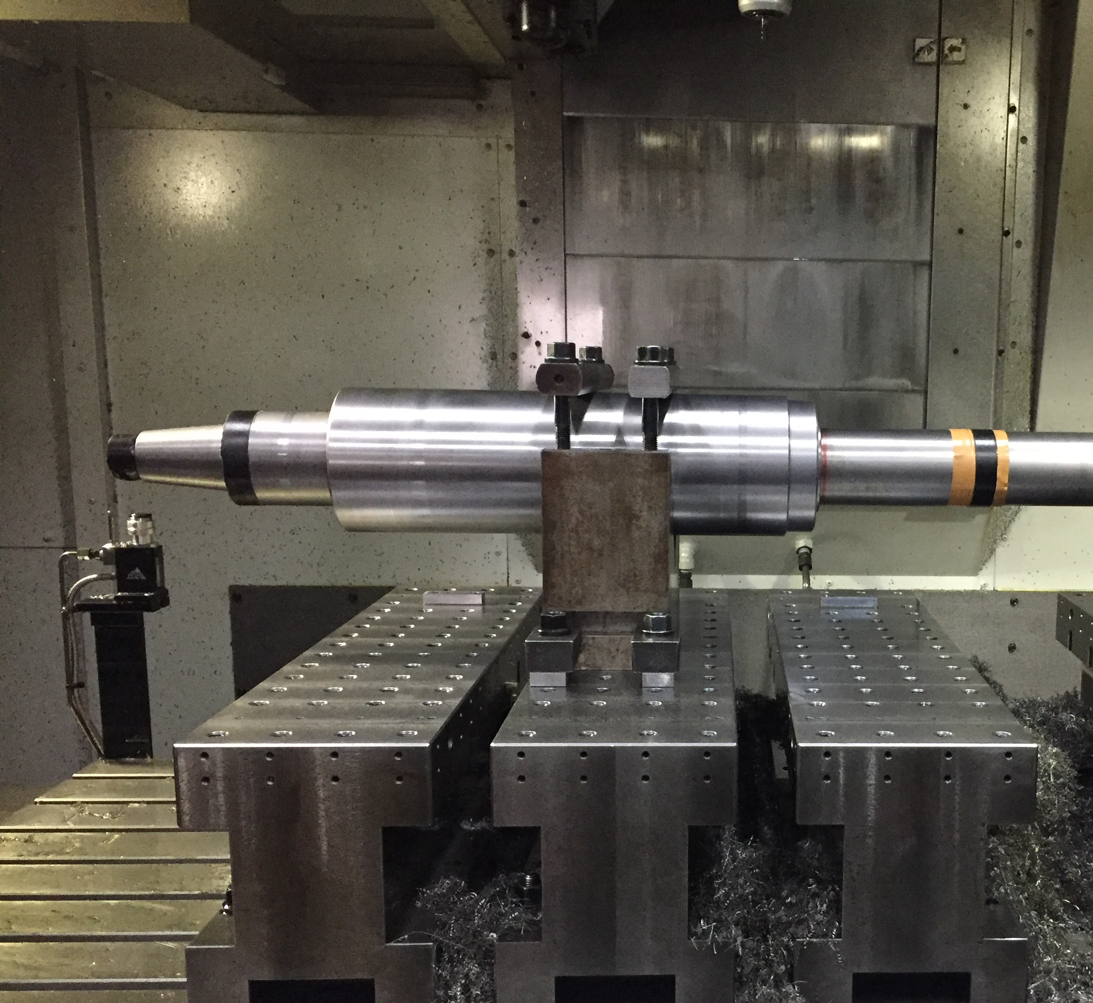 i’m setting up to machine a shaft on a large machining center, and I’m using a V-block to secure it.