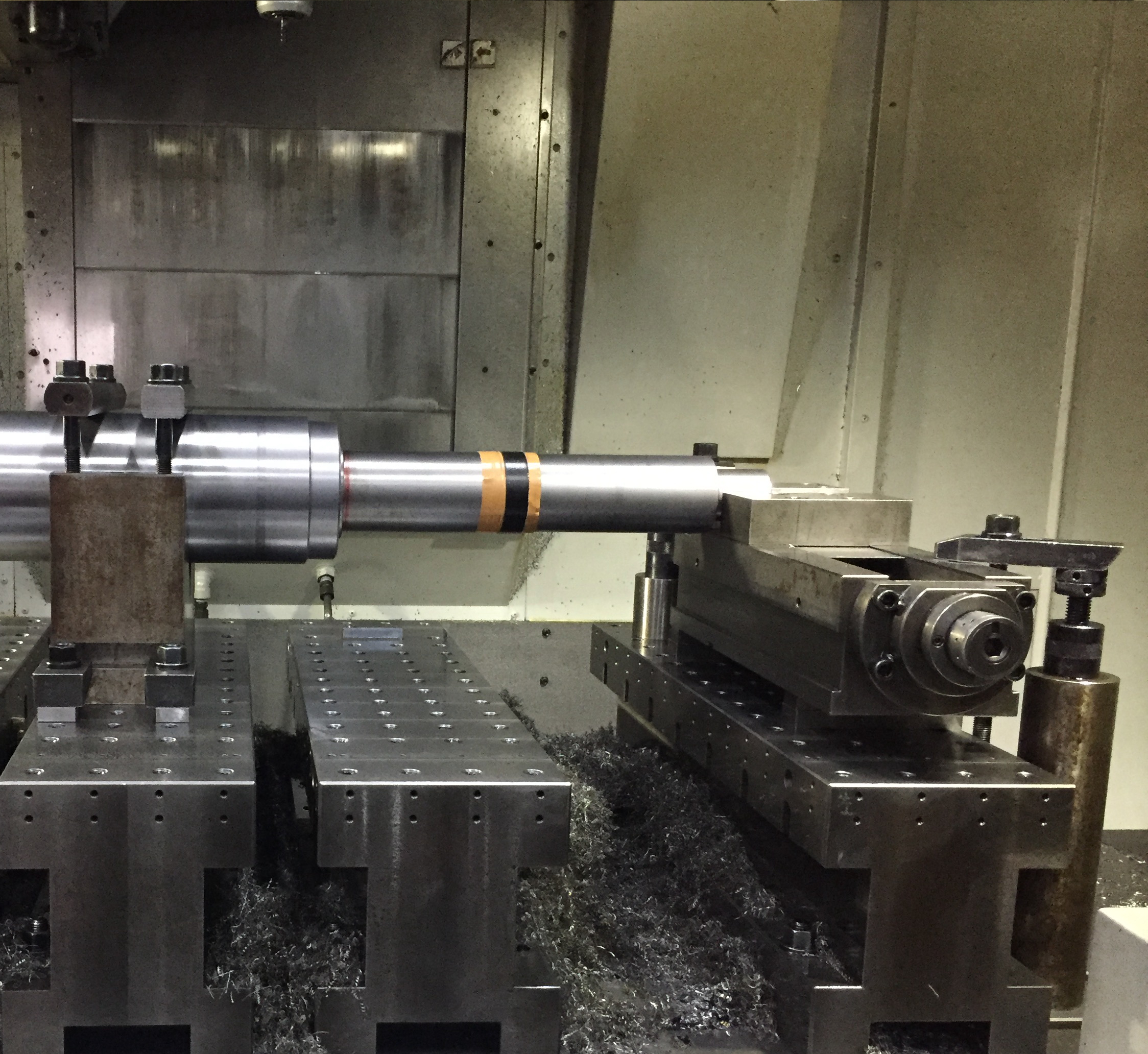 立形の大型マシニングセンタで主軸をV字ブロックに乗せてキー溝加工をするときのフリー画像です。