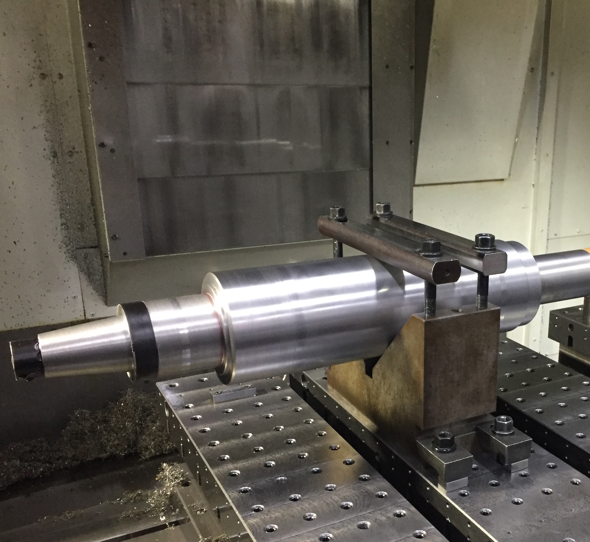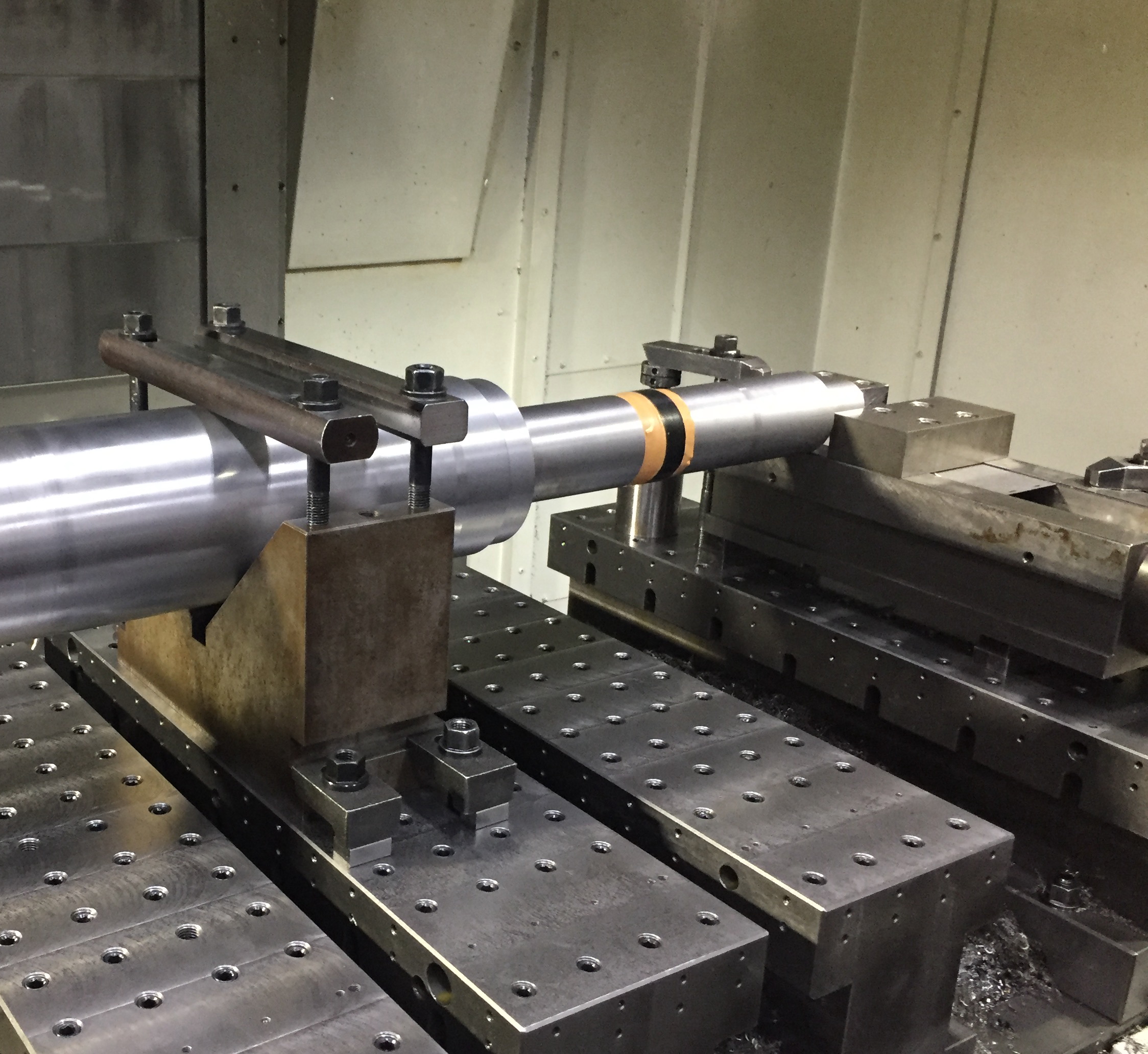 段付きの主軸は重心のあるところをV字のブロックを使って、そこをメインに位置決めと固定をし、加工部分はバイスなどで補助的に固定をします。